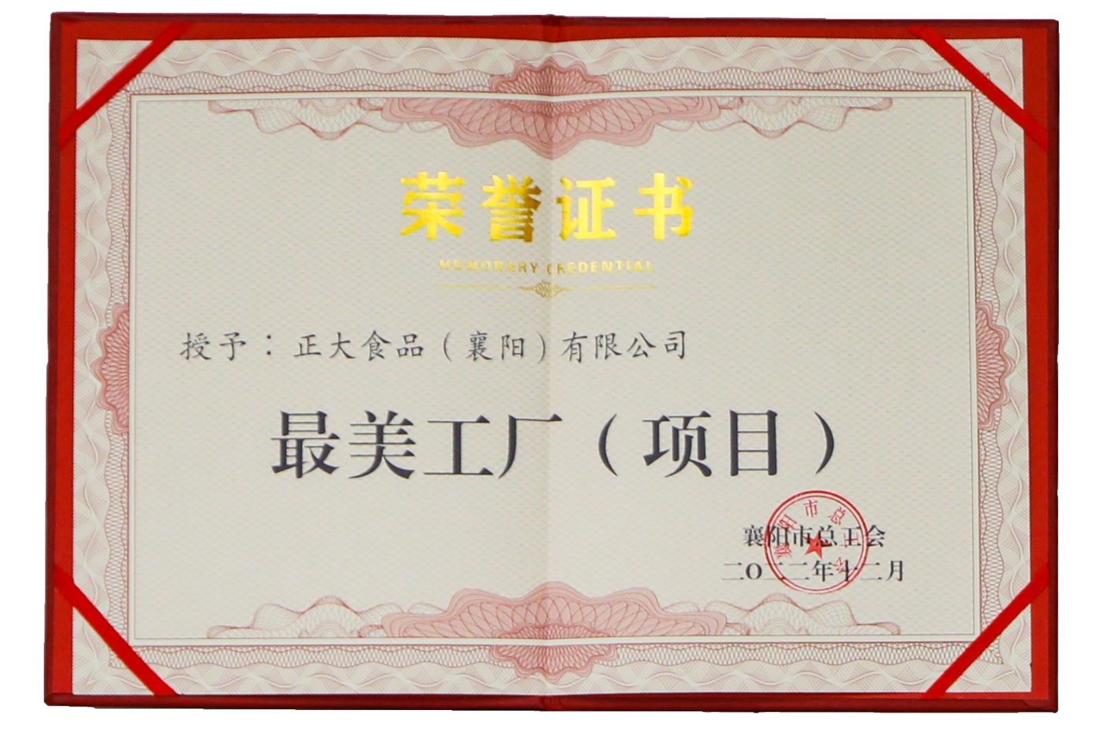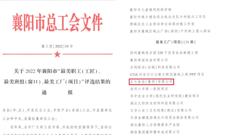 為廣泛開展美好環(huán)境與幸福生活共同締造活動(dòng),評(píng)選為襄陽市經(jīng)濟(jì)社會(huì)高質(zhì)量發(fā)展做出積極貢獻(xiàn)的單位和群體及個(gè)人,襄陽市總工會(huì)開展了尋找襄陽市“最美職工(工匠)、最美工廠(項(xiàng)目)、最美班組(窗口)”的活動(dòng)。歷時(shí)2個(gè)月的多輪評(píng)定,襄陽市總工會(huì)決定授予正大食品(襄陽)有限公司——襄陽市“最美工廠(項(xiàng)目)”獎(jiǎng)項(xiàng)。